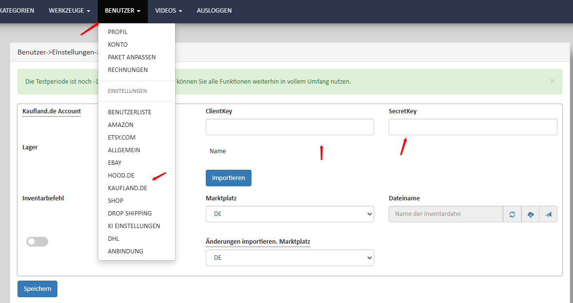 • Klicken Sie auf Menü "Benutzer->Einstellungen->eBay"
